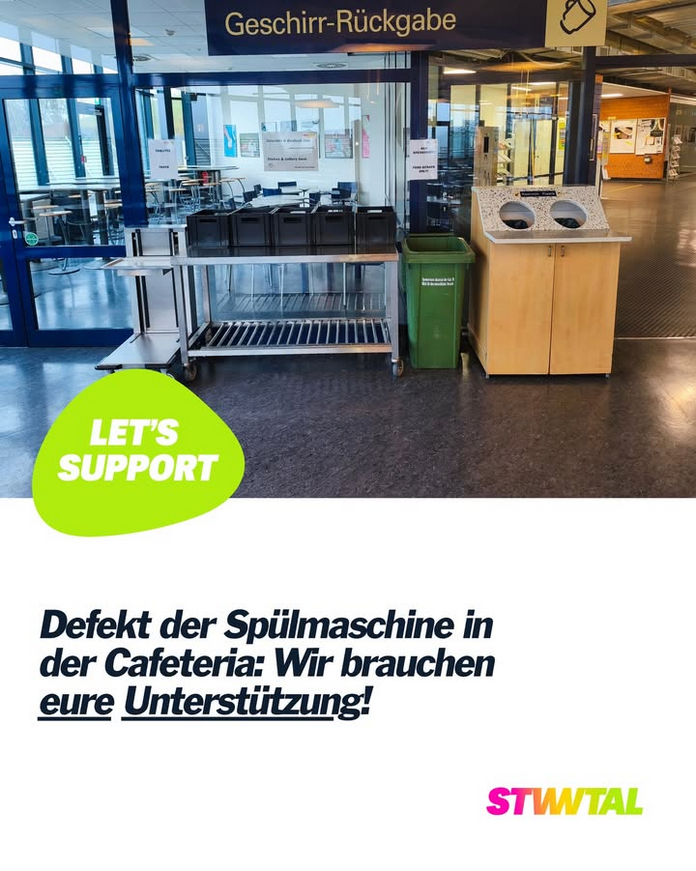 Wir bitten euch, euer Geschirr nach der Nutzung dort abzustellen und die Station konsequent zu nutzen. Mit eurer Unterstützung helft ihr uns, auch während der technischen Störung einen möglichst reibungslosen Ablauf in der Cafeteria sicherzustellen.