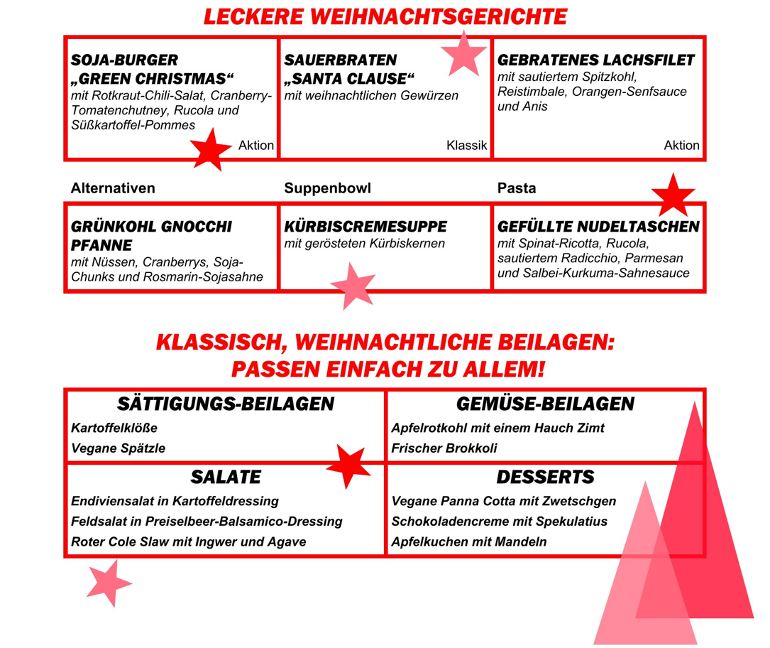 Schau dir hier die Speisen an und versetz dich in vorweihnachtliche Stimmung. Abgerundet wird das festliche Menü mit verlockenden Dessertoptionen.
