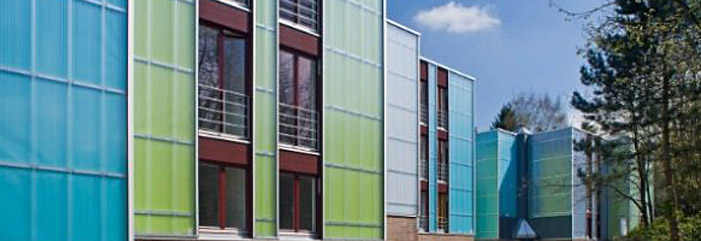 Die 2012 erbauten drei modernen Studierendenwohnhäuser mit 84 möblierten Wohnplätzen wurden mit drei Architekturpreisen ausgezeichnet. Details >